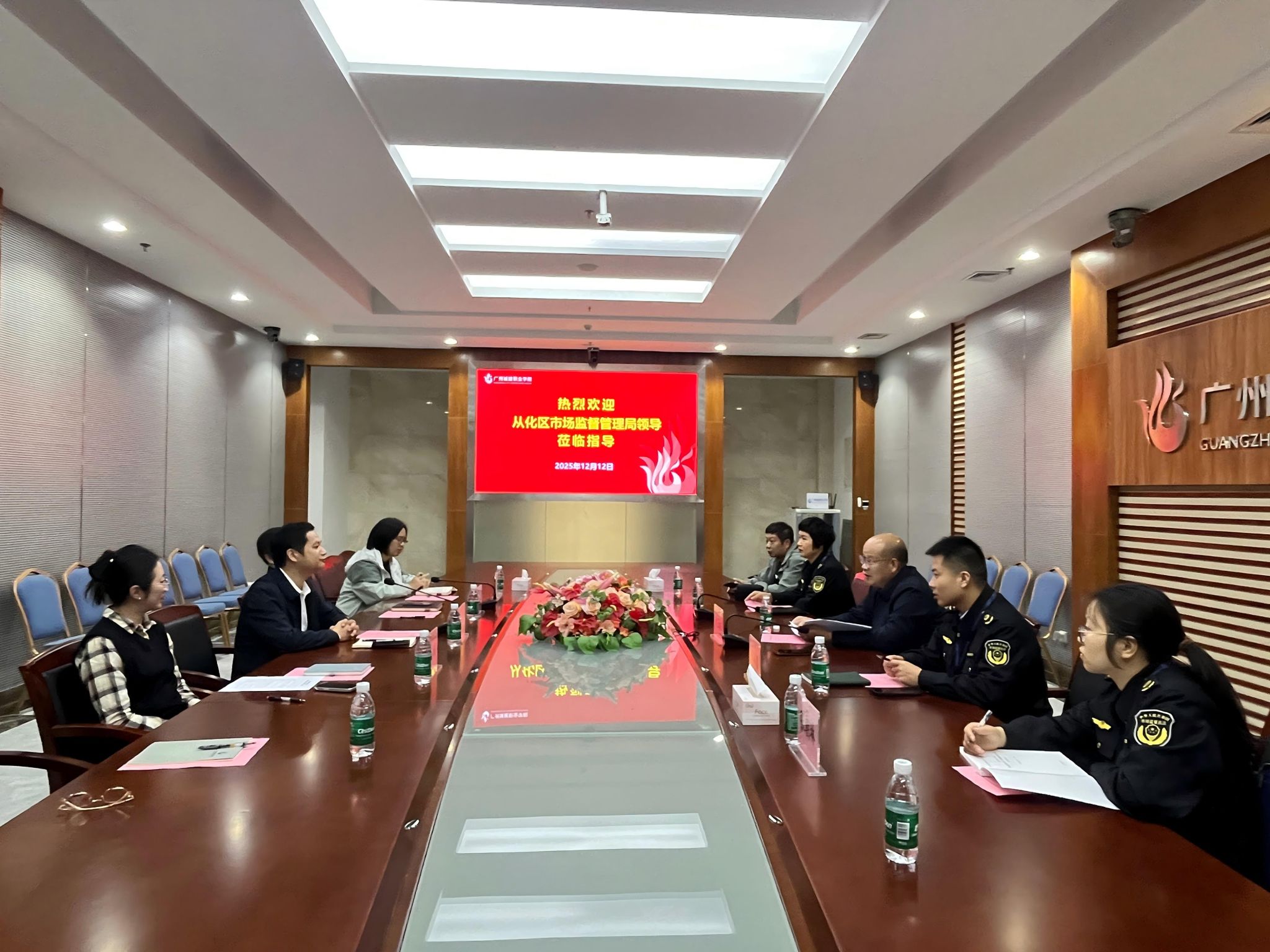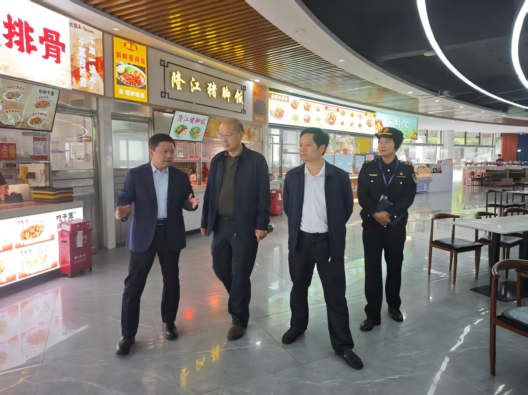 12月12日上午,从化区市场监督管理局局长李卫权一行4人到我校指导食品安全工作,学校副校长孔练光、后勤管理服务有限公司常务副总经理吴锐、后勤处处长李琼及相关负责人参加调研。