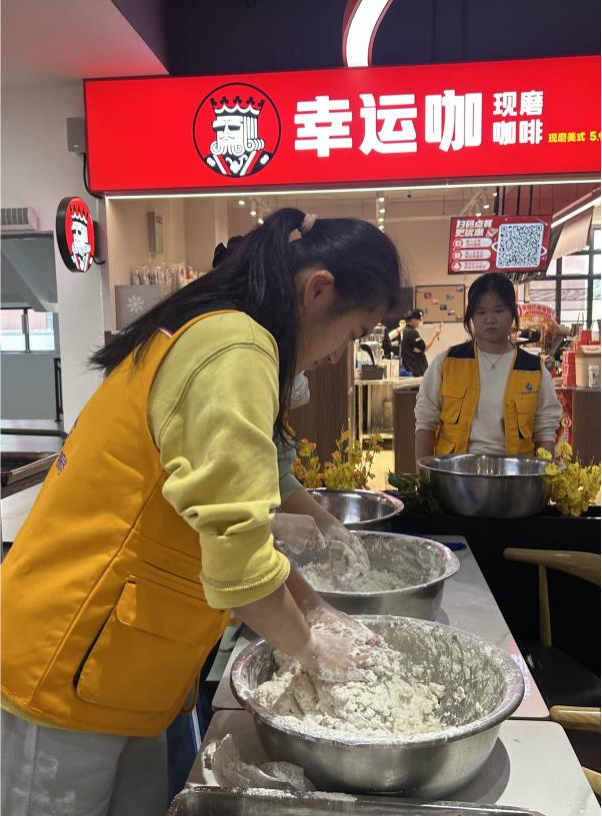 傍晚时分,两校区食堂内暖意融融、笑语声声。特别策划的“巧手包汤圆,共话冬至情”体验活动,吸引了众多学生参与。在各食堂经理的指导下,同学们围坐一起,揉面、包馅、搓圆,亲手制作汤圆,体验传统习俗的乐趣。现场气氛热烈,指尖流转的是手艺,心中传递的是情谊。许多同学表示:“第一次包汤圆,不仅学会了传统手艺,也更感受到节日的仪式感和同学之间的温情。”