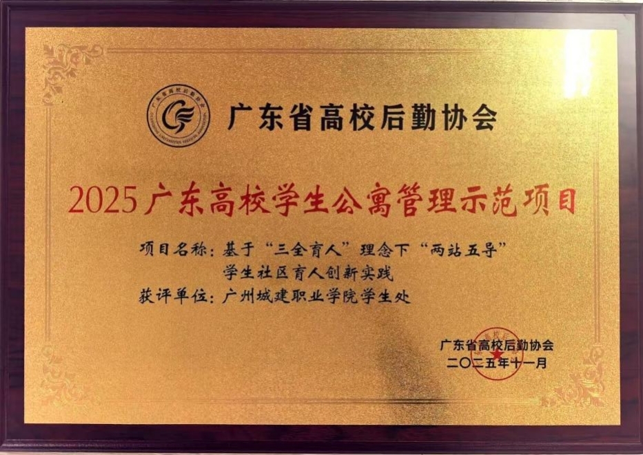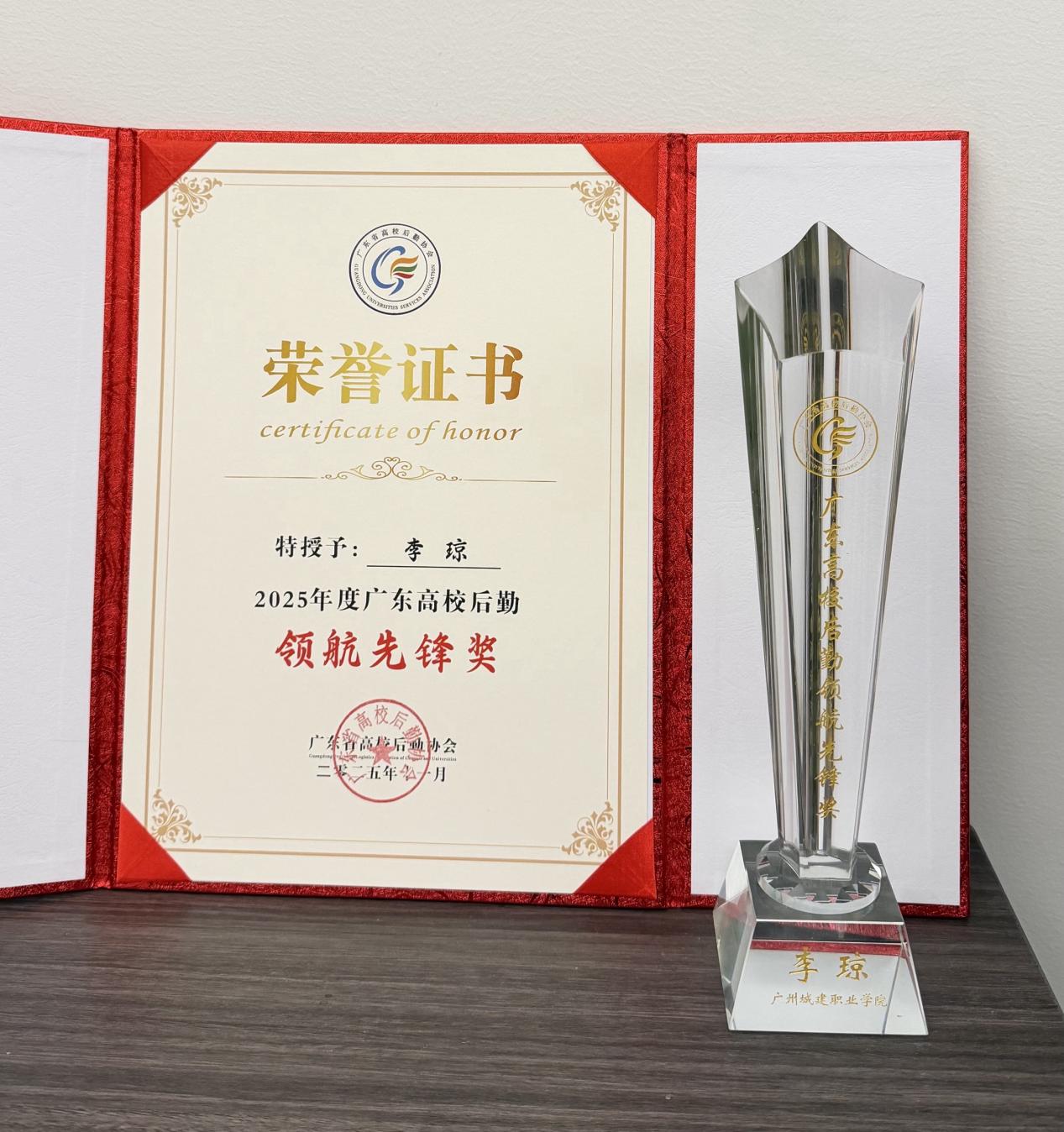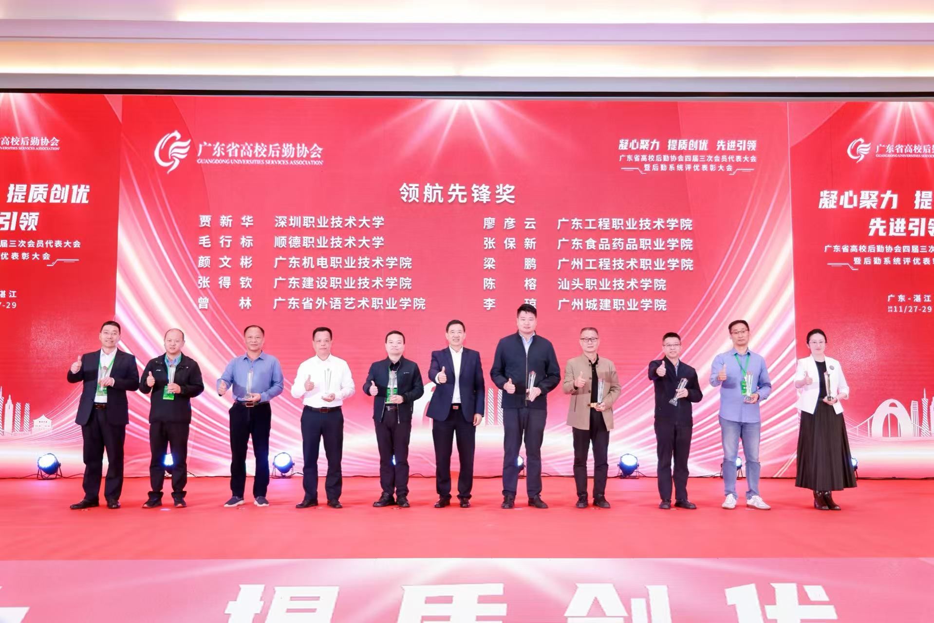 11月27日至29日,广东高校后勤协会第四届三次会员大会及后勤系统评优评先表彰活动在广东省湛江市举行。我校在评选中喜获佳绩,其中《基于“三全育人”理念下的“两站五导”学生社区育人创新实践》获“2025年广东高校后勤学生公寓管理示范项目”,后勤处处长李琼荣获“2025广东高校后勤领航先锋奖”。